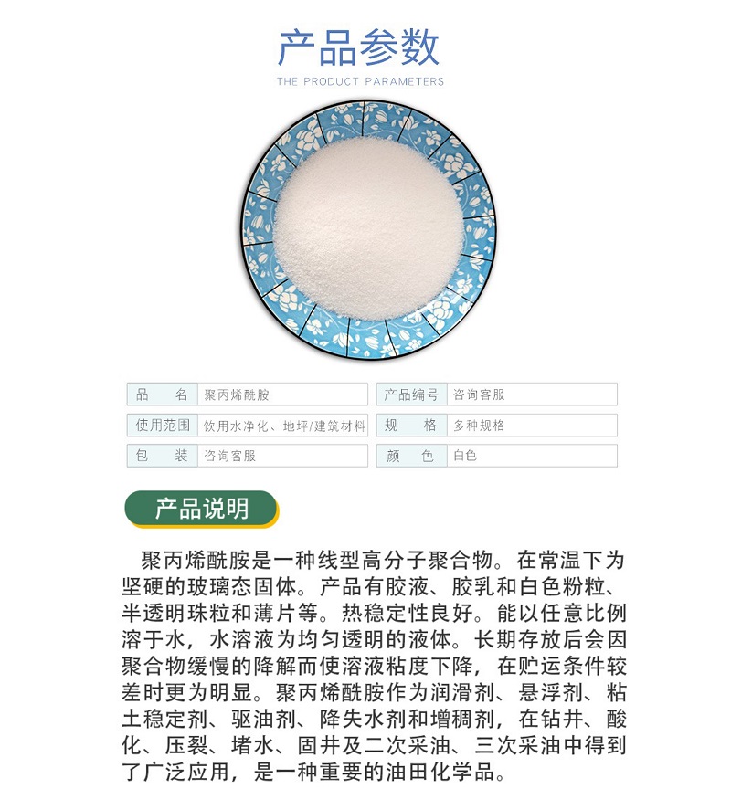 造紙助劑:在造紙工業(yè)中可用作紙張干強(qiáng)劑 助留劑 ,能極大的提高紙張質(zhì)量 節(jié)約成本,提高造紙廠的生產(chǎn)能力?梢灾苯优c無機(jī)鹽離子,纖維以及其它有機(jī)高分子發(fā)生靜電橋梁作用以達(dá)到增強(qiáng)紙張的物理強(qiáng)度,減少纖維或填料的流失。加快濾水 起到了增強(qiáng)  助留 助濾的作用,同時(shí)在脫模過程中起到了明顯的絮凝效果。